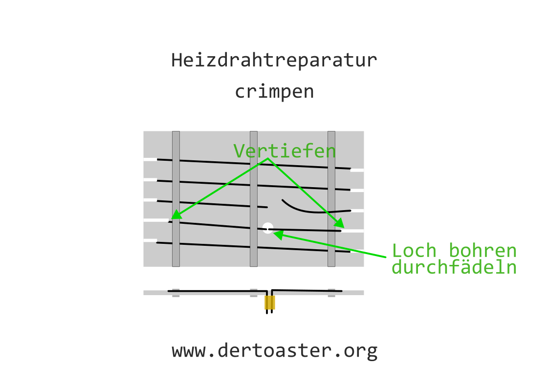 An der Stelle des Heizdrahtrisses ein kleines Loch bohren. Den Einschnitt für den Heizdraht an der Glimmerplatte links und rechts um 2 cm vertiefen um somit genügend Heizdraht zum durch fädeln zu haben. Heizdraht nach außen durchführen und fest verpressen. Hierfür eine Crimpzange oder sehr kräftige Flachzange verwenden. ACHTUNG: Die abstehende Verbindung darf keine Metallteile im Toaster berühren. Weder das Gehäuse noch die Gitterstäbe im Inneren.