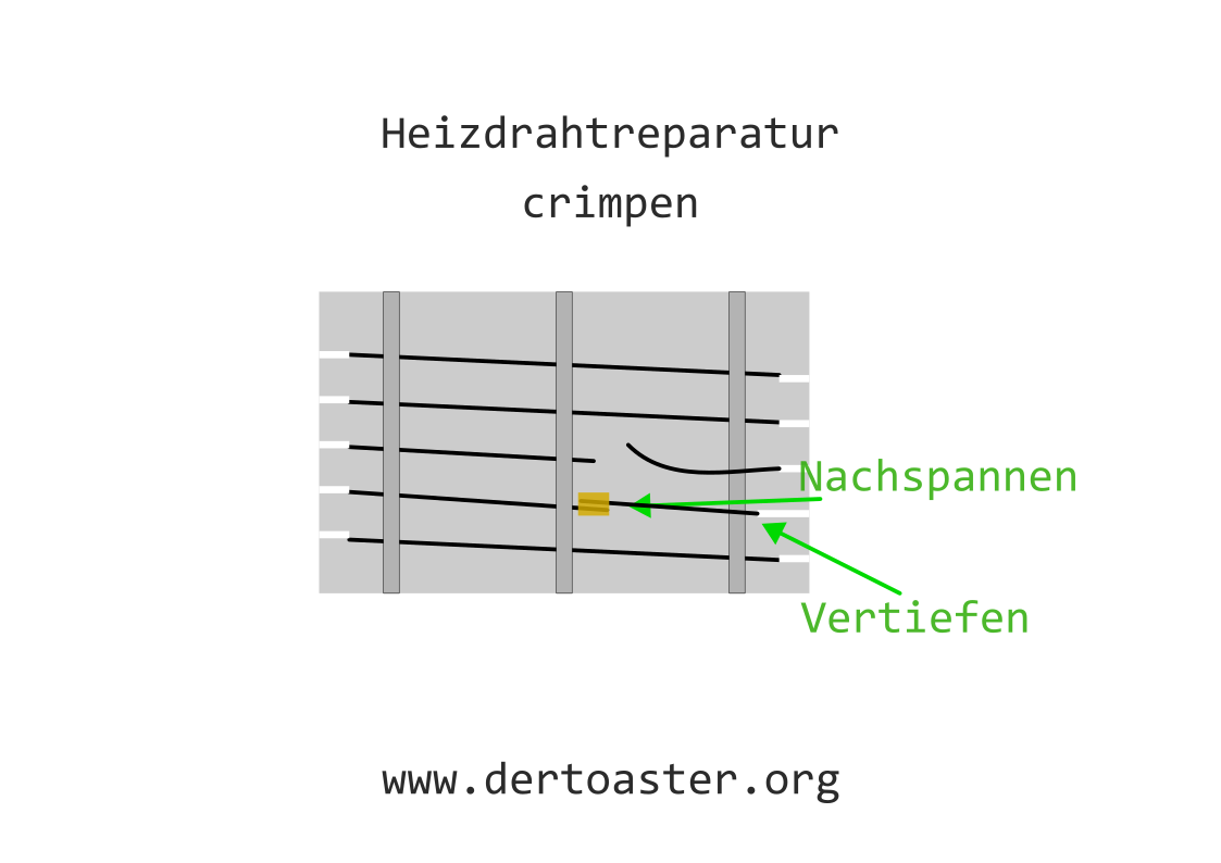 Die Gesamtlänge des Heizdrahtes darf NICHT verkürzt werden. 2 - 3 cm sind akzeptabel. Wenn mehr Heizdraht fehlt wird der Heizdraht heißer und bei einer elektronischen Toastersteuerung bekommt diese mehr Spannung ab und wird dadurch zerstört!!!
