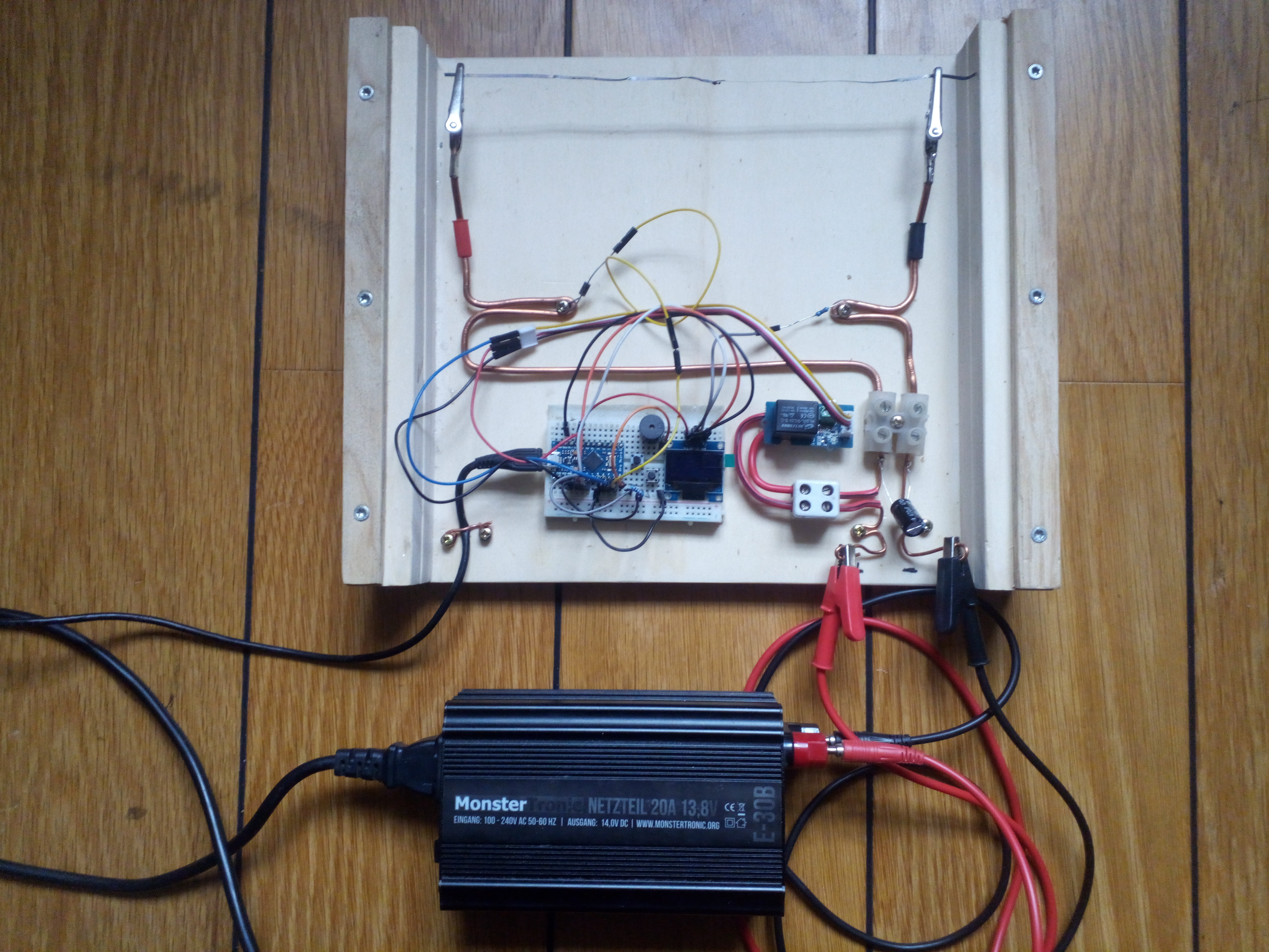 Versuchsaufbau um dem punktgeschwiessten Heizdraht einer Dauerbelastung zu unterziehen.