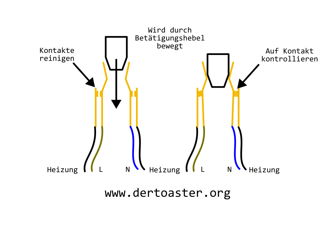Ein Typischer Fehler besteht darin, dass trotz intakter Heizdrähte sich diese nicht erwärmen und auch kein Funktionslicht aufleuchtet. Das kann an oxidierten oder verschmutzen Kontakten liegen. Sie könnten auch etwas verbogen sein. Die beiden Hauptkontakte werden durch den Hebel aneinandergedrückt und sind mit den beiden Adern (braun und blau) des Anschlußkabels verbunden. Ohne Gehäuse kann stromlos der Hebel betätigt und überprüft werden ob sich die Kontakte berühren. Falls sich die Kontakte berühren noch untersuchen ob die Kontakte auch "blank" sind. Mit einem sehr feinen Schleifpapier können die Kontakte gereinigt werden. Zu Empfehlen ist auch eine Widerstandsprüfung von Heizung auf L und von Heizung auf N. Der Widerstand sollte von Kontakt zu Kontakt nicht mehr als 1 Ohm betragen.