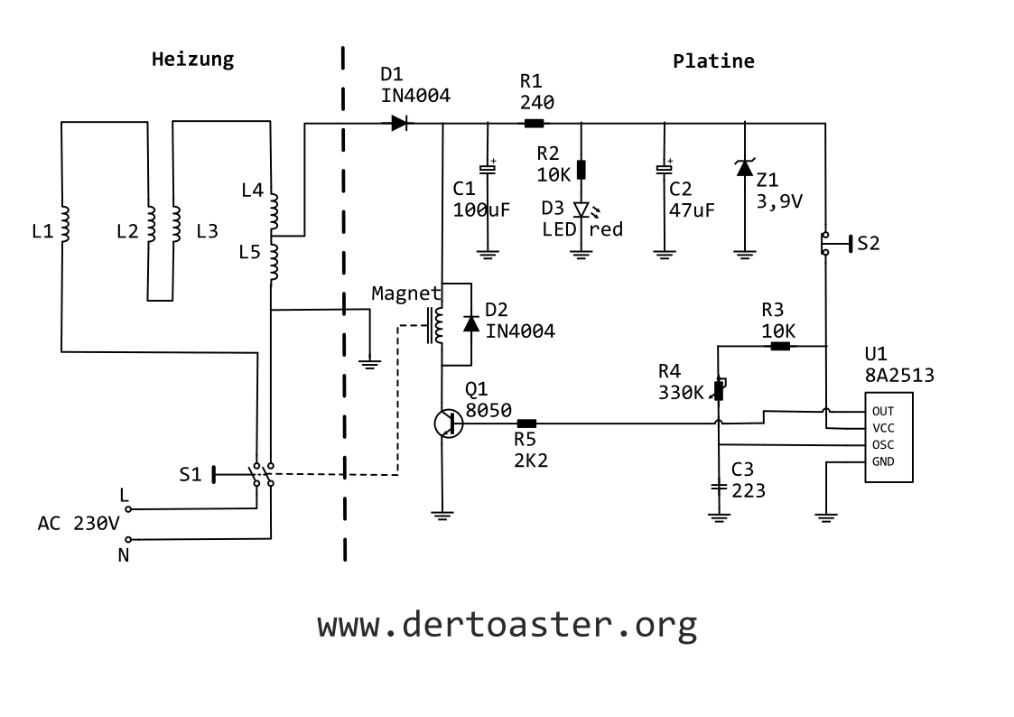 Das Prinzip der Spannungsteilung wird bei den meisten modernen Toastern verwendet um die Steuerung mit einer niedrigeren Spannung als der Netzspannung zu versorgen. Wenn man das obige Schaltbild betrachtet steht die Summe der Widerstände R1, R2, R3, R4 und R5 zu dem Widerstand R5 wie 230 V Netzstpannun zu der Versorgungsspannung der Steuerung.